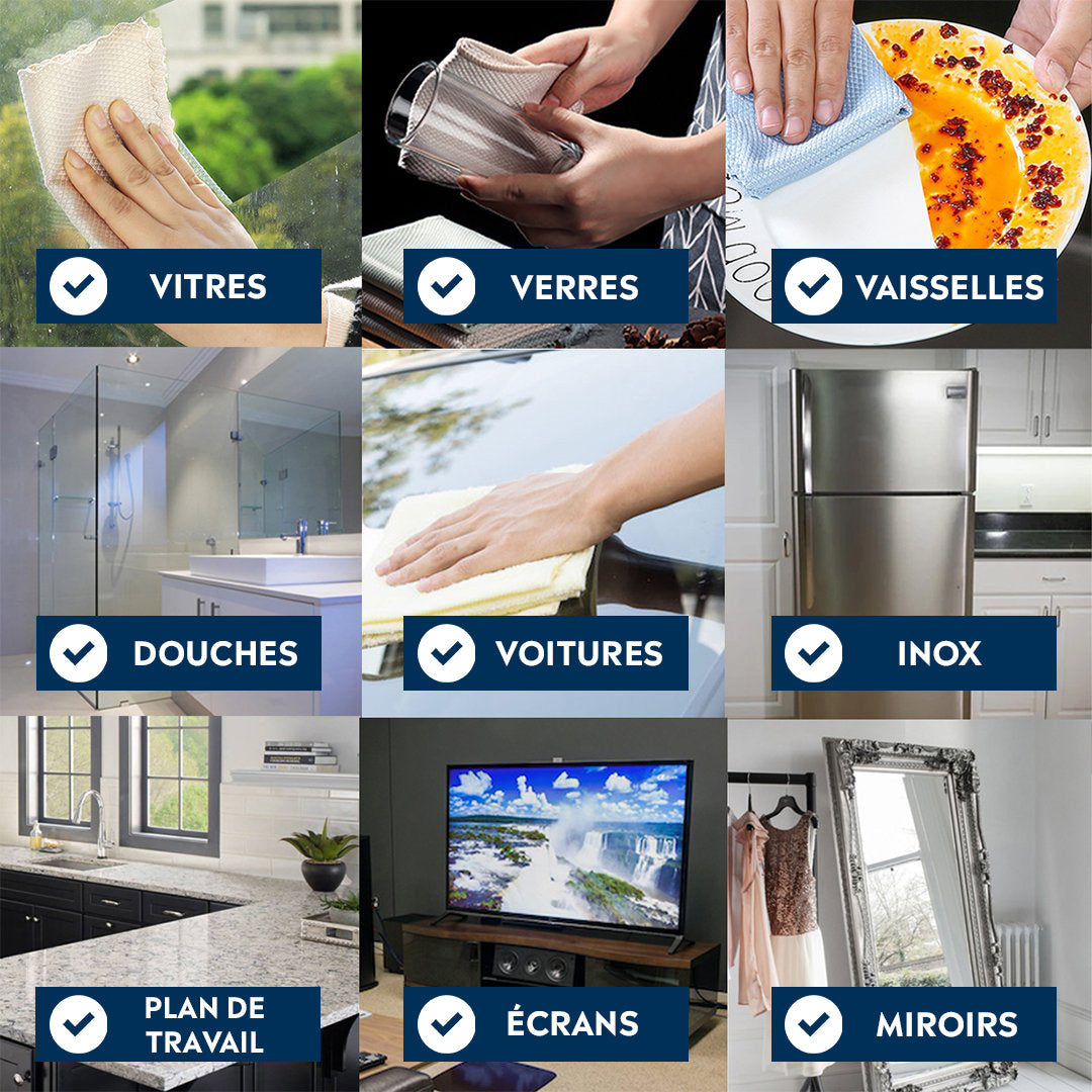 Le secret est sa technologie de fabrication révolutionnaire inspirée des écailles de poisson. Il ne ressemble à aucun autres chiffons que vous avez déjà essayé. Humidifié avec de l'eau, le chiffon microfibre est idéal pour nettoyer les fenêtres, les éviers, les douches, les vitres, les miroirs, etc.